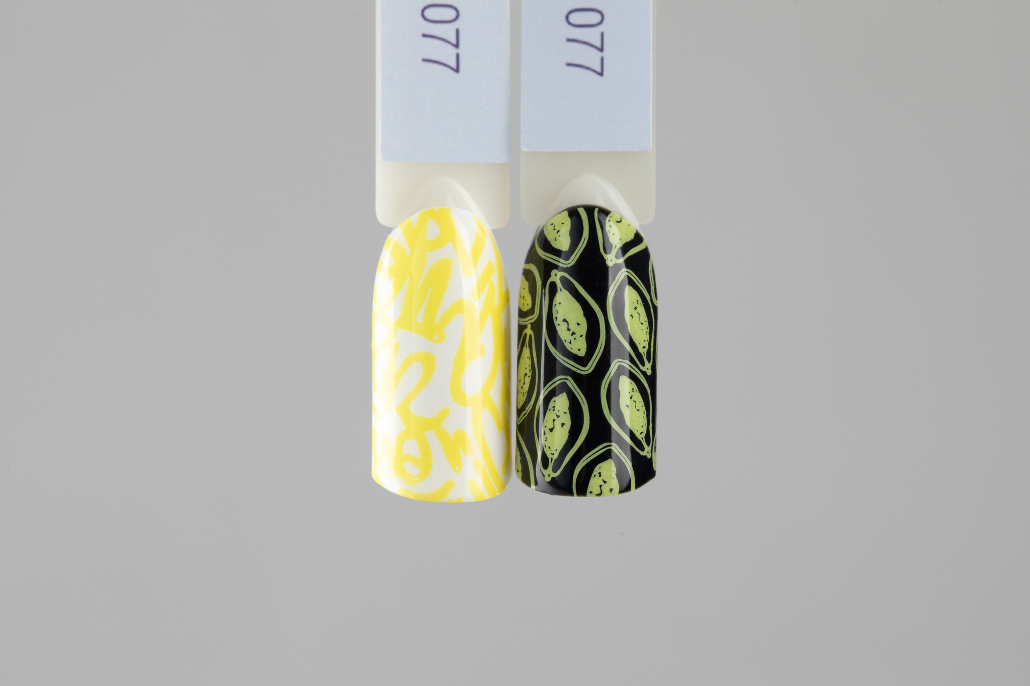 077 – Лимонно-желтый. Насыщенный, спелый, яркий тон. прекрасно сочетающийся с другими оттенками палитры. Подойдет для создания дерзких и необычных дизайнов.