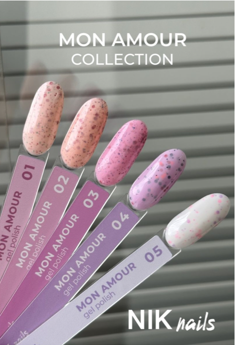 Гель-лаки Mon Amour от NIK nails с разноцветными вкраплениями.