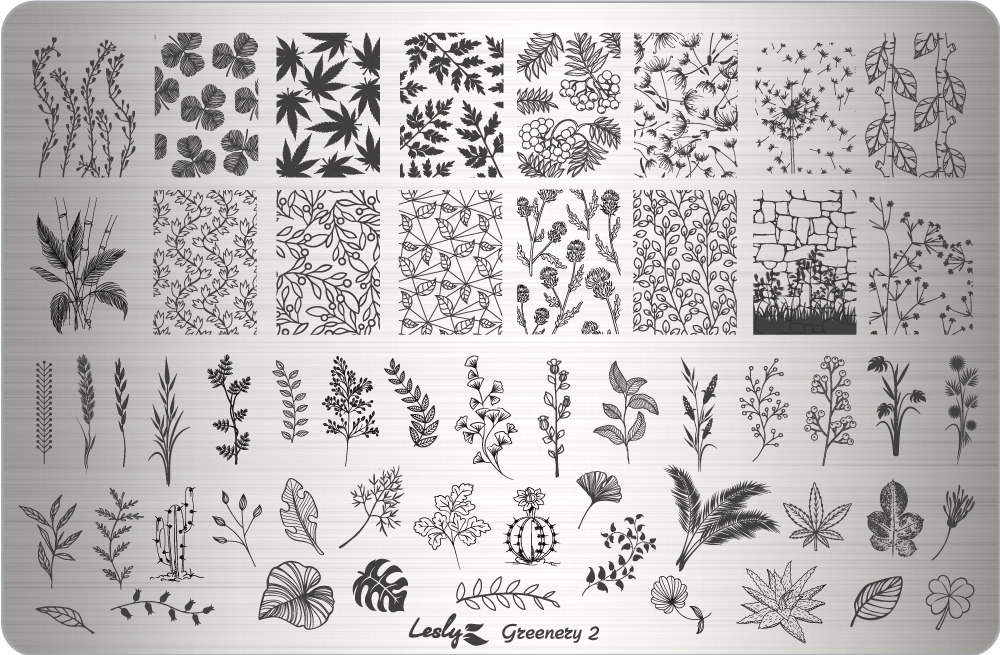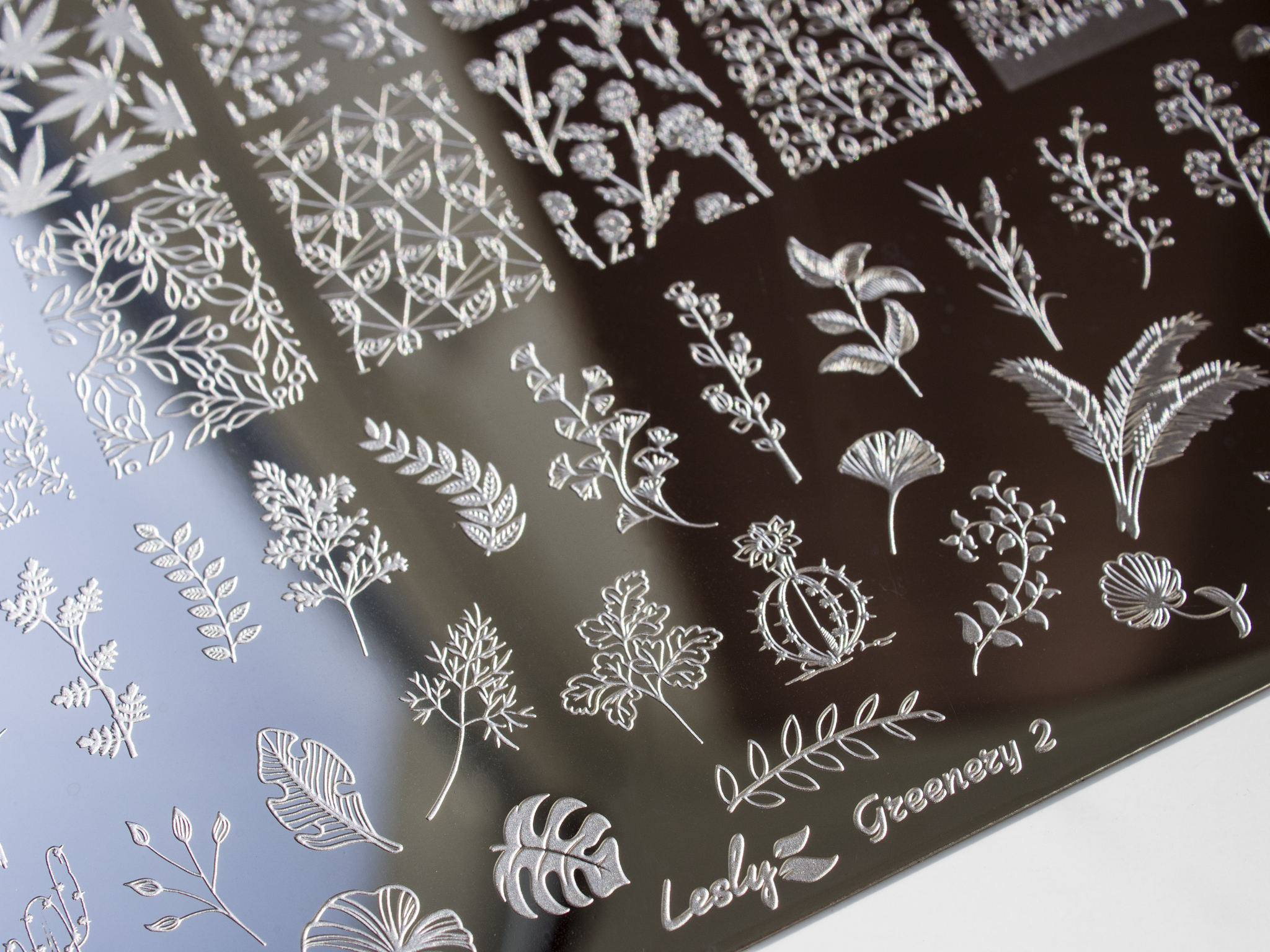 Бренд «Lesly» имеет мировую известность в бьюти-индустрии, в нейл-арте в частности. Основной продукт «Lesly» - плитки для стемпинга. Изготовлены из нержавеющей стали, имеют качественную гравировку. Каждая плитка помещена в индивидуальный картонный конверт со смотровым окошком. Модель: Greenery 2