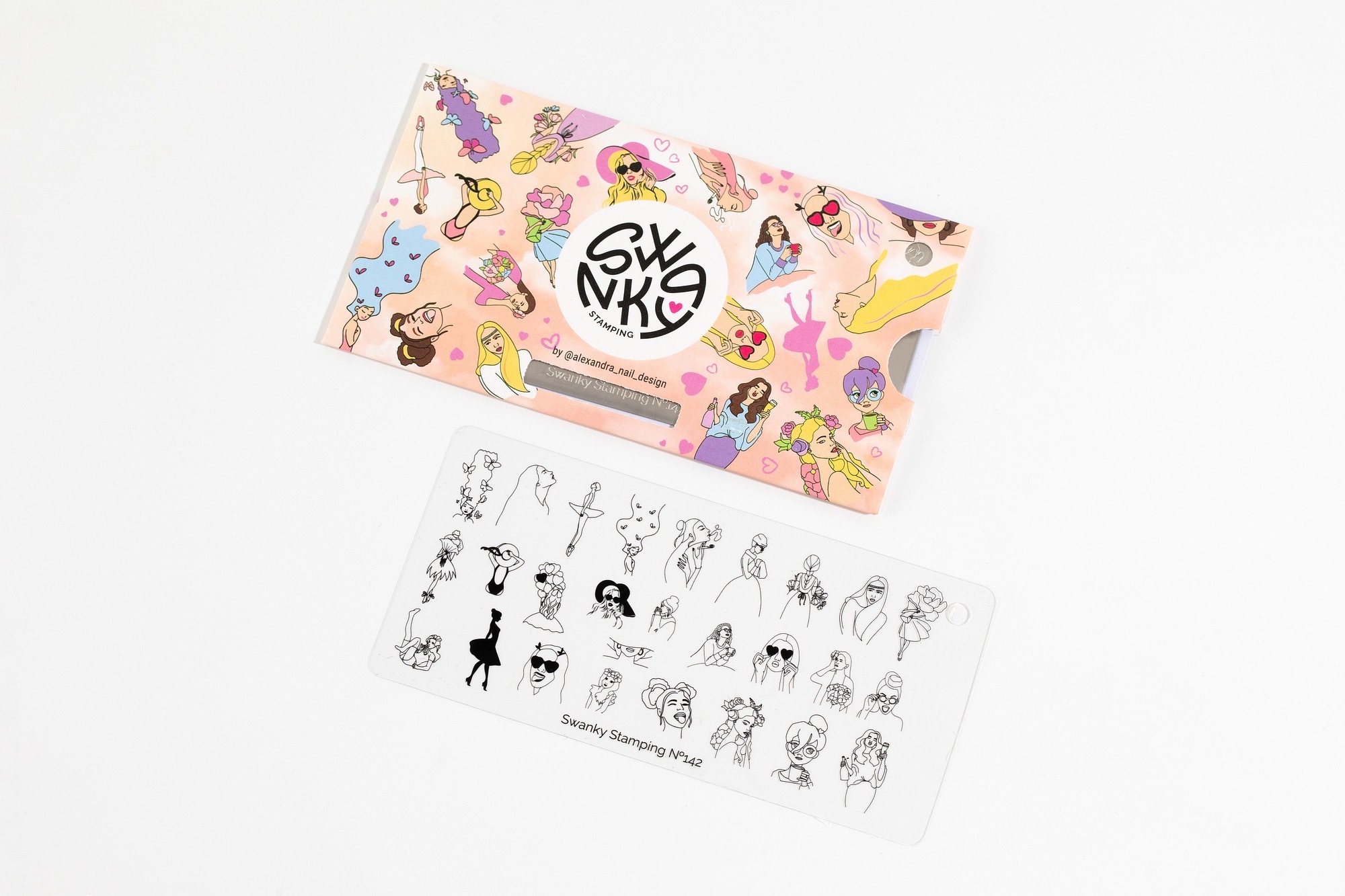 Пластина 142 — совместная работа с талантливой @alexandra_nail_design. Нежная, наполненная, одиночными рисунками силуэтов девушек, имеющий тонкий и мечтающий характер. Дизайн прекрасно подойдет для техники реверсивного стемпинга. Все элементы можно разукрасить в любой цвет и украсить маникюр утонченной, романтичной натуры.