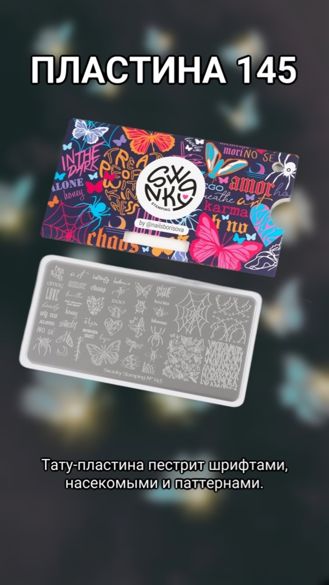Рады представить вашему вниманию пластину в стиле тату, от талантливой @nailsborisova. Большое количество надписей в различных шрифтовых решениях, бабочки, насекомые и универсальные паттерны, такие как паутинка и колючки. Изображения отлично сочетаются друг с другом, создавая каждый раз уникальную композицию маникюра.