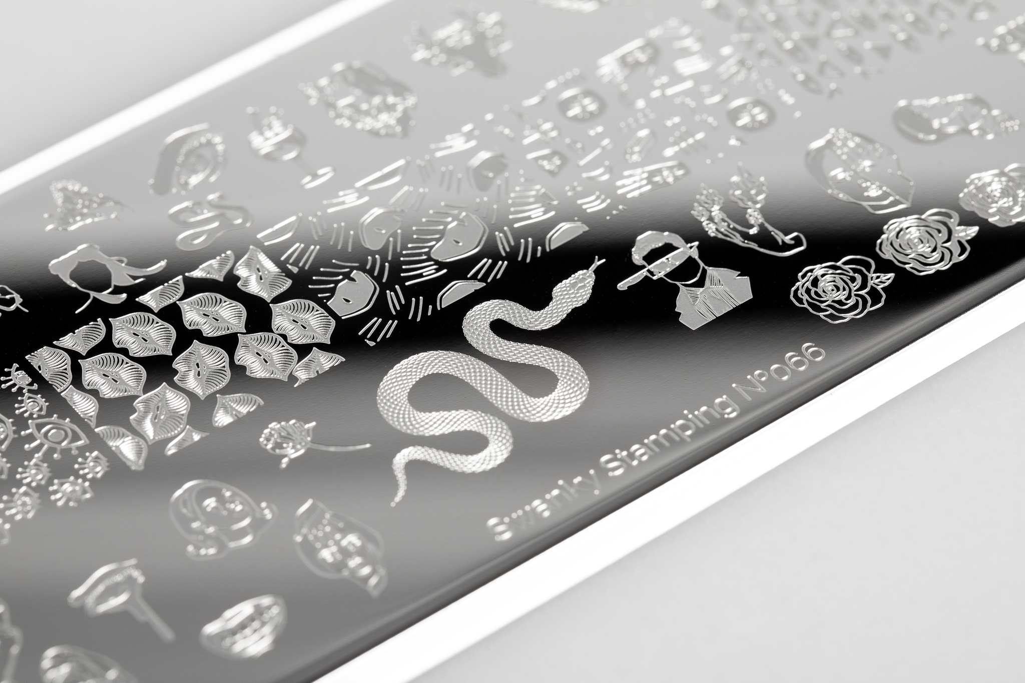Пластина с иллюзорными одиночными рисунками, с совершенно нереальными абстрактными паттернами, извилистой змеёй, которую можно расположить на нескольких ногтях.
