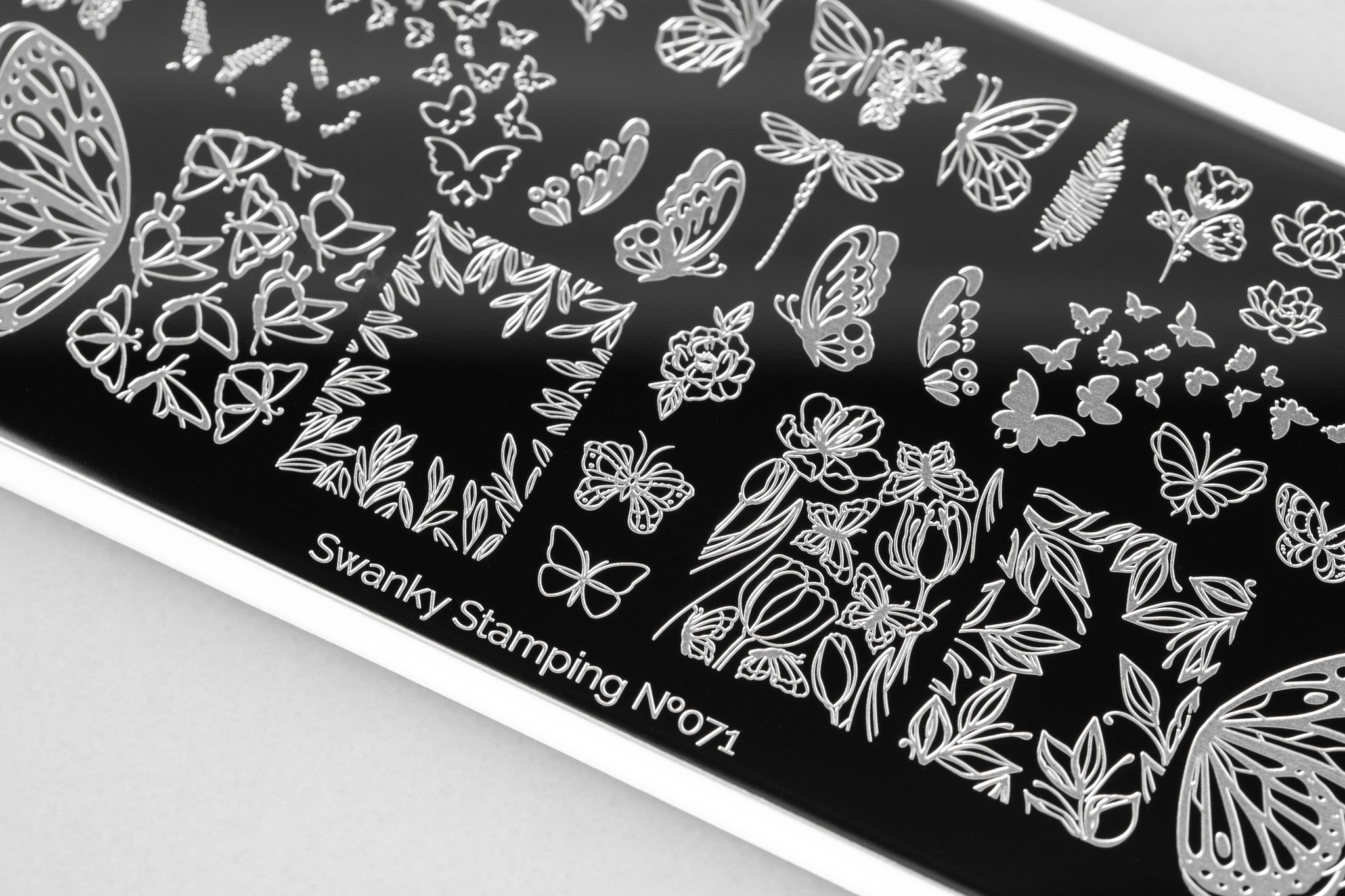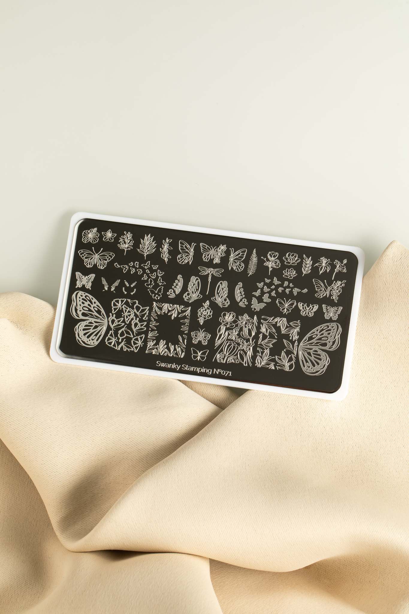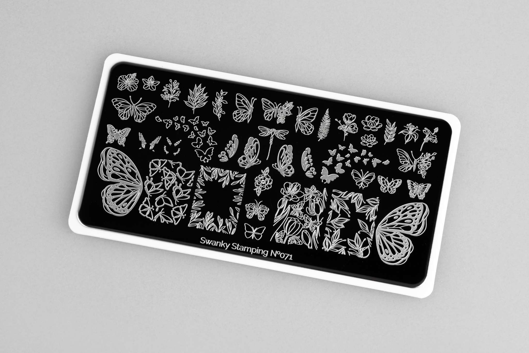 Изящная пластина с бабочками, которая не оставит вас равнодушными. Бабочки с цветочным крылом, которое вы можете комбинировать, послойные рисунки, паттерн крыла, который можно использовать в техники реверсивного стемпинга и каждый раз создавать уникальные, яркие дизайны.