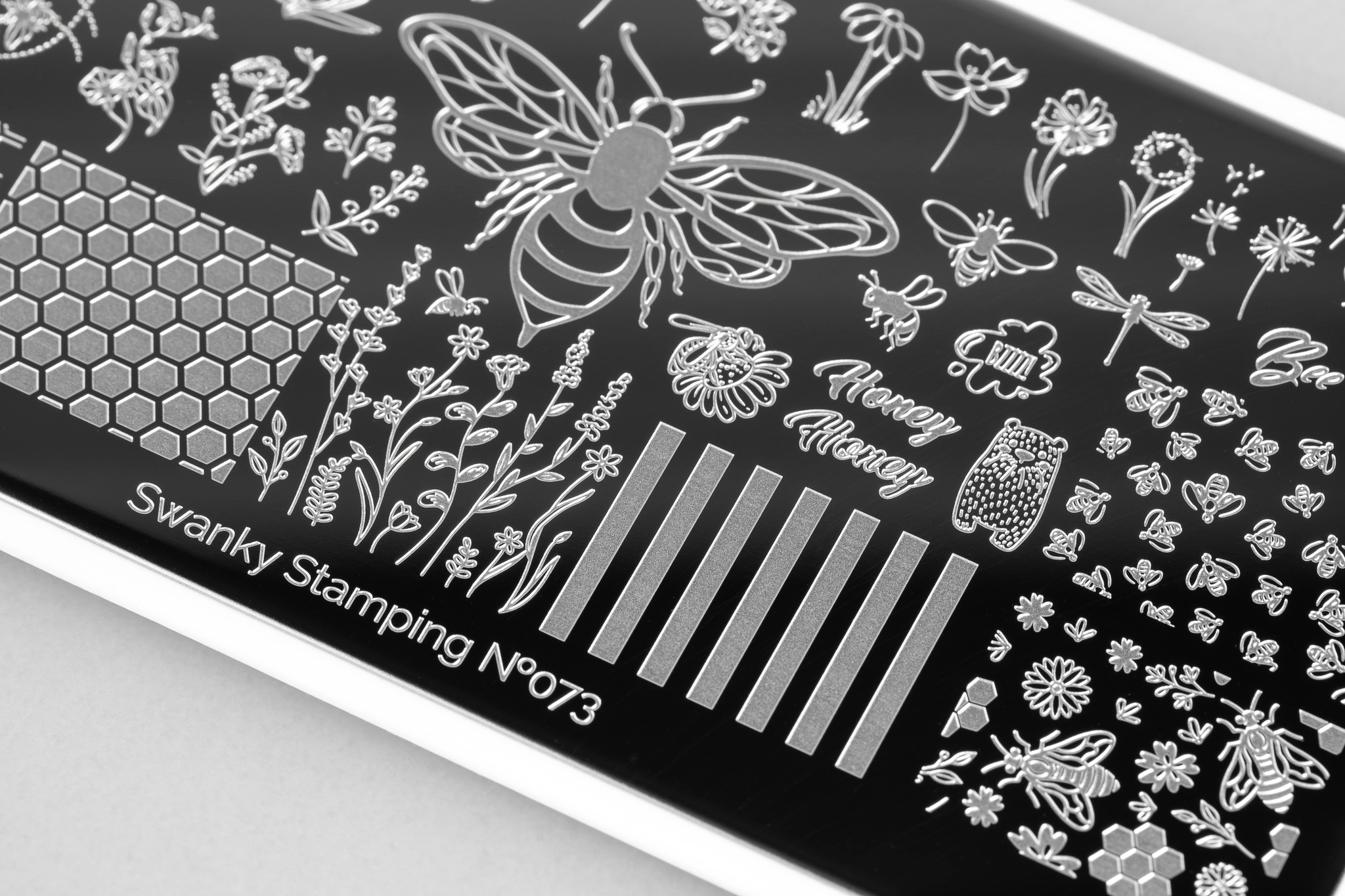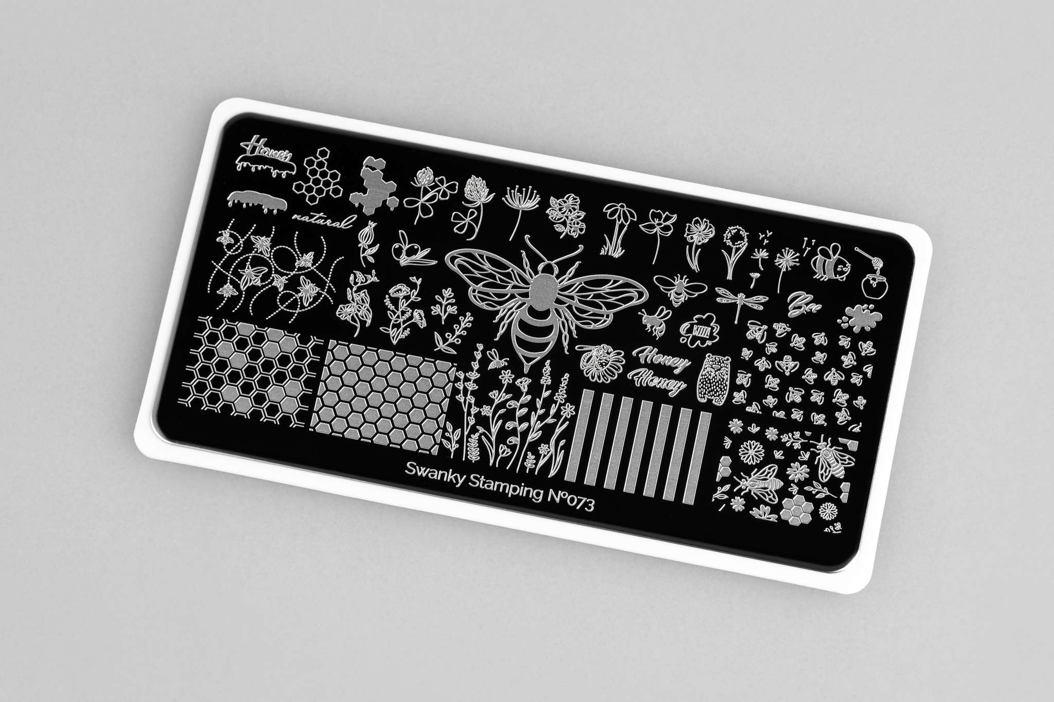 Самая «сладкая» пластина с пчелами, медоносными растениями и сотами. Пчелы являются трендом уже не первый сезон. Многие известные бренды используют изображения этих насекомых и сот в принтах одежды, в украшениях. Теперь можно создавать тренд и на ногтях, благодаря дизайнам этой пластине.