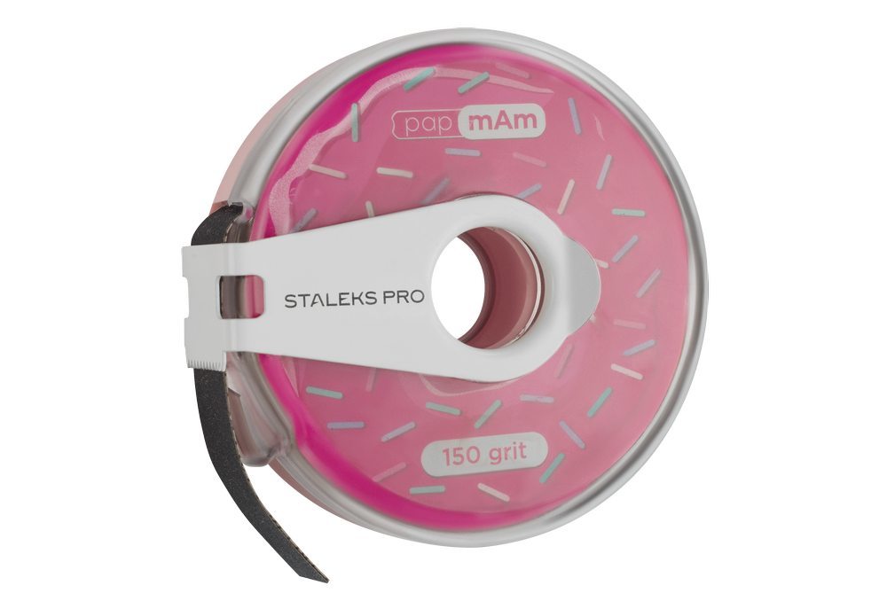 Пластиковый пончик Expert имеет металлическую клипсу и полимерный стоппер, который способствует чёткой фиксации papmAm перед отсоединением. Высота катушки не превышает 38,9 мм, диаметр составляет 104 мм. Пластиковый блок имеет яркий дизайн, в зависимости от гритности абразивной ленты внутри отличается и фон корпуса. Использование пончика Staleks ATC повышает уровень гигиеничности процедур: футляр защищает наждак от загрязнений и попадания пыли. В одном рулоне содержится до 75 одноразовых файлов для пилок, фактическая длина ленты достигает 6 м. Абразив, позволяющий обрабатывать как натуральные, так и нарощенные ногти, представлен в четырех вариантах жесткости: 100, 150, 180 и 240 грит. Высокая прочность полимера, из которого изготовлен пончик Сталекс, допускает многоразовое использование блока, меняя только абразивные ленты.