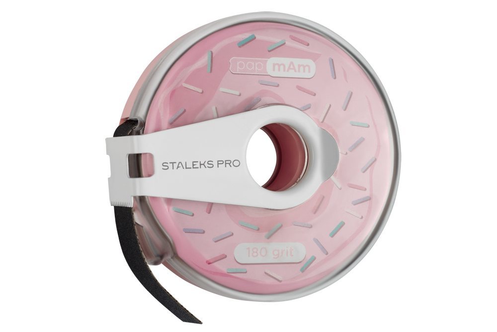 Пластиковый пончик Expert имеет металлическую клипсу и полимерный стоппер, который способствует чёткой фиксации papmAm перед отсоединением. Высота катушки не превышает 38,9 мм, диаметр составляет 104 мм. Пластиковый блок имеет яркий дизайн, в зависимости от гритности абразивной ленты внутри отличается и фон корпуса. Использование пончика Staleks ATC повышает уровень гигиеничности процедур: футляр защищает наждак от загрязнений и попадания пыли. В одном рулоне содержится до 75 одноразовых файлов для пилок, фактическая длина ленты достигает 6 м. Абразив, позволяющий обрабатывать как натуральные, так и нарощенные ногти, представлен в четырех вариантах жесткости: 100, 150, 180 и 240 грит. Высокая прочность полимера, из которого изготовлен пончик Сталекс, допускает многоразовое использование блока, меняя только абразивные ленты.
