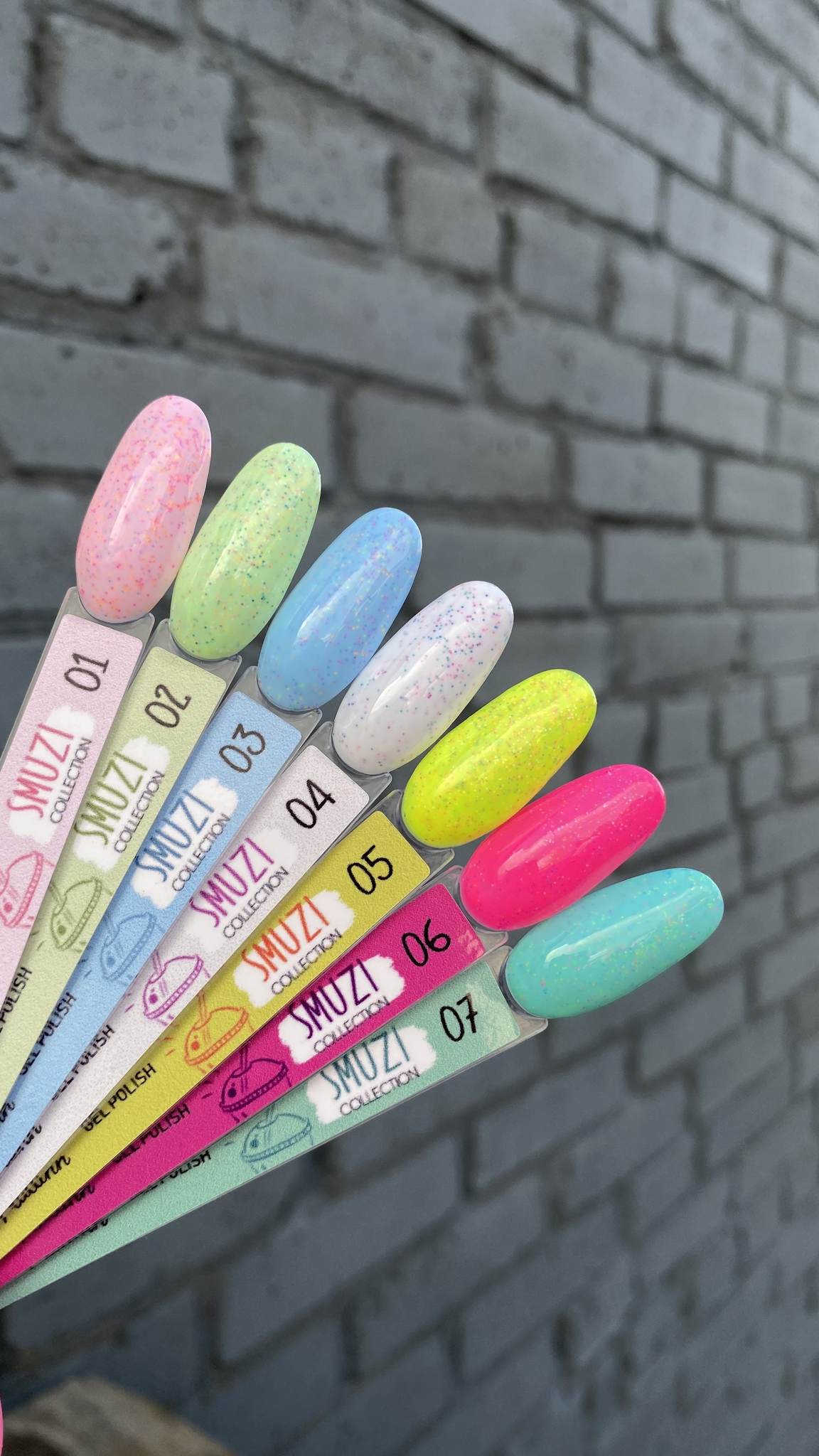 Цветной гель-лак с цветными крапинками. Плотные, на типсах нанесены в 1 слой